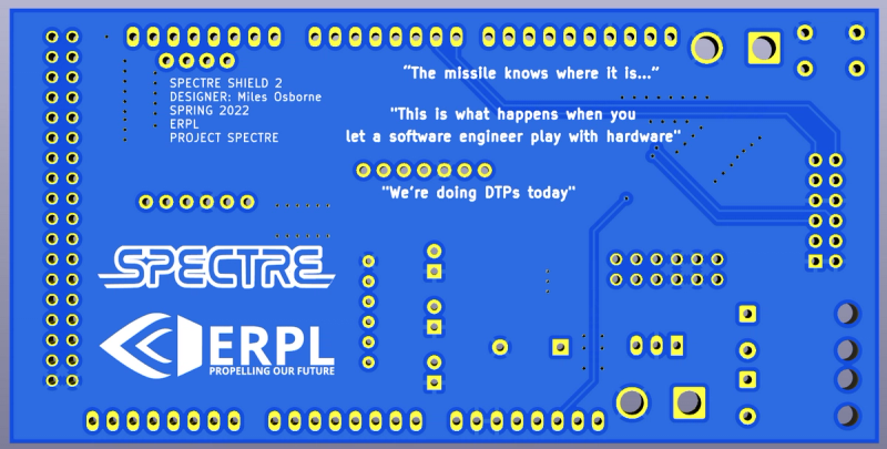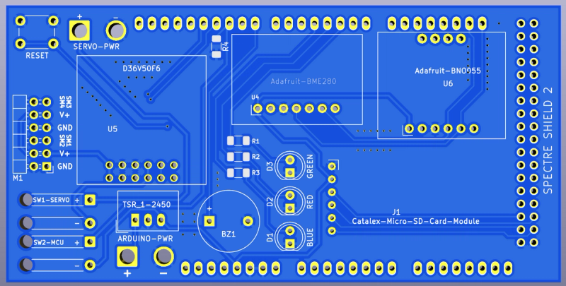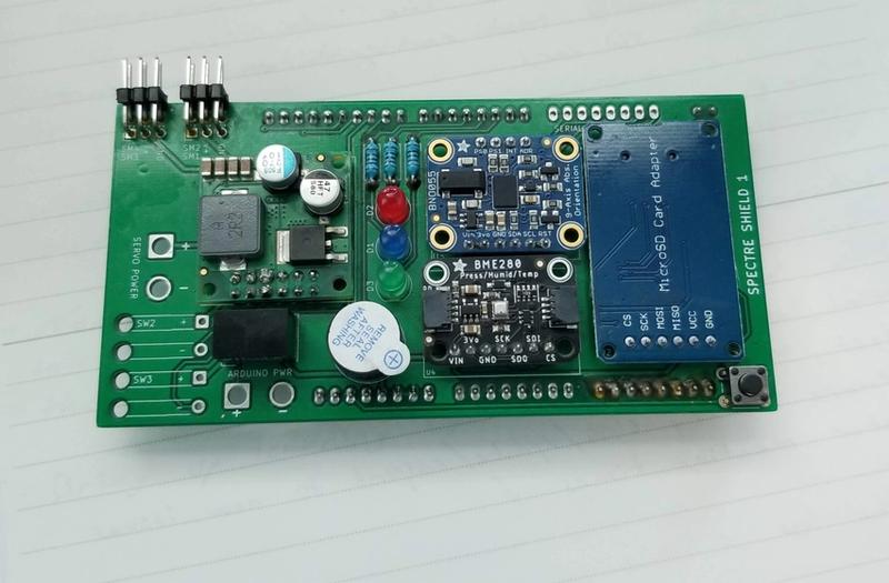 Three iterations of the flight computer exist. The first one, designed as a shield for an Arduino Mega, contained all of the sensors listed above except for the high-G accelerometer. The computer required separate batteries for the computer itself and the servo motors. This iteration of the flight computer suffered defects, and was not able to manipulate the canards. The layout of the computer also made it very difficult to work with when installed in the Spectre Module. This board was flown on Spectre's first flight as a data recording device only, a task that it was mostly successful with.